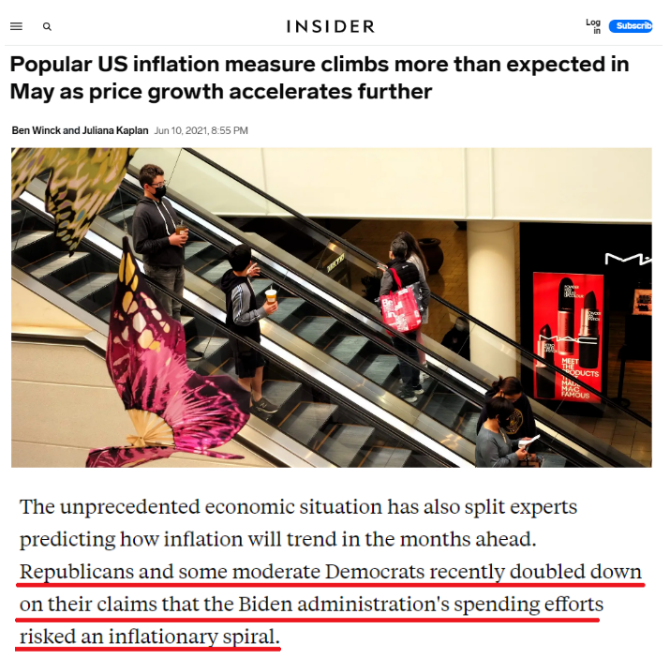據(jù)美國“商業(yè)內(nèi)幕”網(wǎng)站報(bào)道,共和黨人及一些溫和的民主黨人最近加倍強(qiáng)調(diào),拜登政府的大額支出可能導(dǎo)致通脹螺旋式上升。