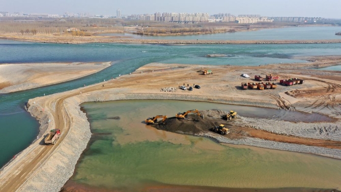 黃河寧夏中衛(wèi)市沙坡頭樞紐至中寧縣白馬鄉(xiāng)段疏浚工程施工現(xiàn)場(無人機(jī)照片,2021年2月25日攝)。新華社記者 王鵬 攝