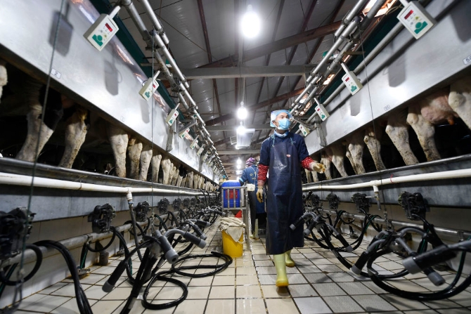 寧夏農(nóng)墾賀蘭山奶業(yè)有限公司工作人員在擠奶臺(tái)工作(2020年11月8日攝)。新華社記者 王鵬 攝
