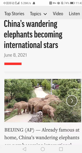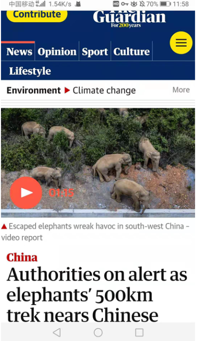 ▼▼▼美聯(lián)社在“中國(guó)游蕩的象群成為國(guó)際明星”報(bào)道中為中國(guó)點(diǎn)贊:大象在中國(guó)受到最高級(jí)別的保護(hù),它們數(shù)量在穩(wěn)步增加。