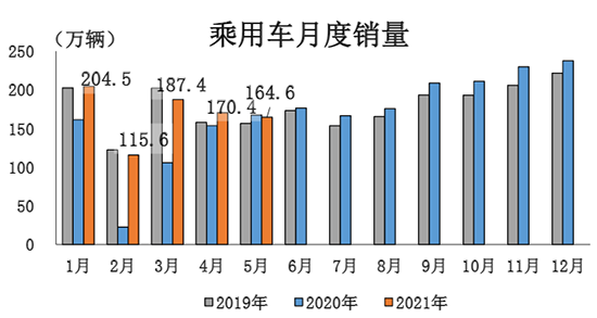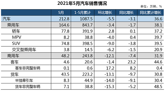 1-5月,汽車產(chǎn)銷分別完成1062.6萬(wàn)輛和1087.5萬(wàn)輛,同比分別增長(zhǎng)36.4%和36.6%,增幅比1-4月繼續(xù)回落17和15.2個(gè)百分點(diǎn)。與2019年同期相比,產(chǎn)銷同比分別增長(zhǎng)3.6%和5.8%,增幅比1-4月擴(kuò)大1.5和1.3個(gè)百分點(diǎn)。