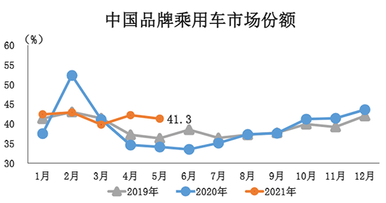 此外,5月,中國(guó)品牌乘用車共銷售67.9萬(wàn)輛,環(huán)比下降5.5%,同比增長(zhǎng)18.6%,占乘用車銷售總量的41.3%,占有率比上月下降0.9個(gè)百分點(diǎn),比上年同期提升7.1個(gè)百分點(diǎn)。分車型來(lái)看,中國(guó)品牌轎車、SUV和MPV市場(chǎng)占有率分別為26.9%、49.9%和72.2%;與上月相比,中國(guó)品牌轎車和SUV的市場(chǎng)占有率均呈小幅下降,中國(guó)品牌MPV明顯增長(zhǎng)。