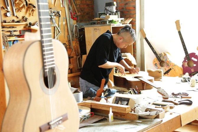周窩音樂小鎮(zhèn),前身是河北省衡水市武強(qiáng)縣周窩村。大家利用住宅“一門一景、一戶一品”規(guī)劃設(shè)計(jì),裝修改造植入音樂、年畫、休閑養(yǎng)生等元素,打造國際級音樂小鎮(zhèn)。圖為吉他作坊 。新華網(wǎng)發(fā)(劉廣生 攝于2021年6月8日)