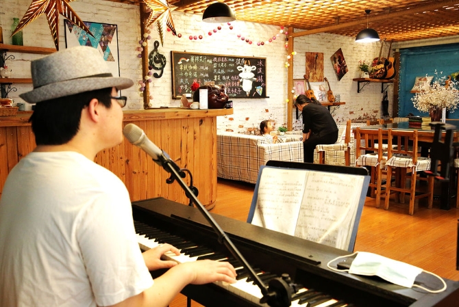 周窩音樂小鎮(zhèn),前身是河北省衡水市武強(qiáng)縣周窩村。大家利用住宅“一門一景、一戶一品”規(guī)劃設(shè)計(jì),裝修改造植入音樂、年畫、休閑養(yǎng)生等元素,打造國際級音樂小鎮(zhèn)。圖為音樂餐廳 。新華網(wǎng)發(fā)(劉廣生 攝于2021年6月8日)
