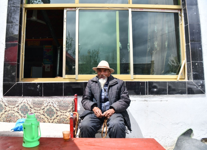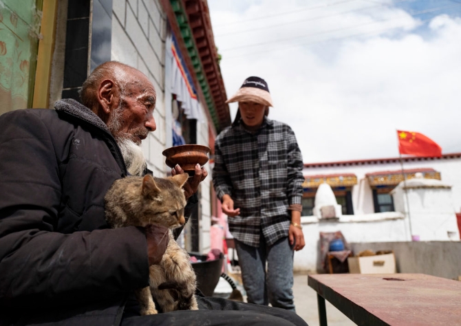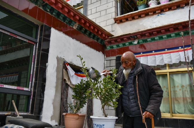 次多杰老人準(zhǔn)備去茶館找老朋友喝茶聊天(4月25日攝)。