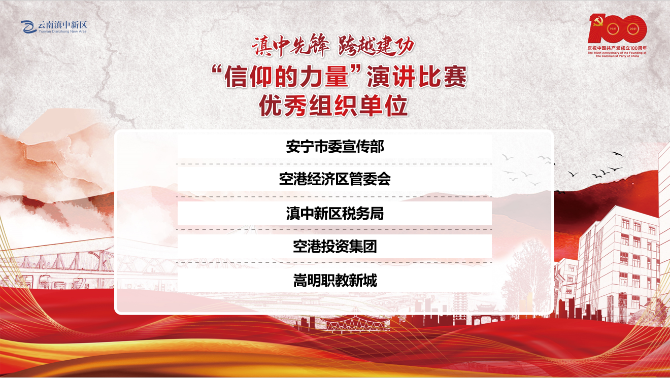 經(jīng)過激烈地角逐,7名選手最終脫穎而出,他們將組成“滇中新區(qū)巡回演講團”并開啟巡回演講,把黨史學習教育的新區(qū)“好聲音”傳遞到新區(qū)機關(guān)、昆明空港經(jīng)濟區(qū)、安寧市、嵩明楊林經(jīng)濟技術(shù)開發(fā)區(qū)等地,引導新區(qū)廣大黨員干部用擔當詮釋初心、用奮斗承載使命,在新時代樹立新區(qū)標準、凝聚新區(qū)精神、展現(xiàn)新區(qū)作為。