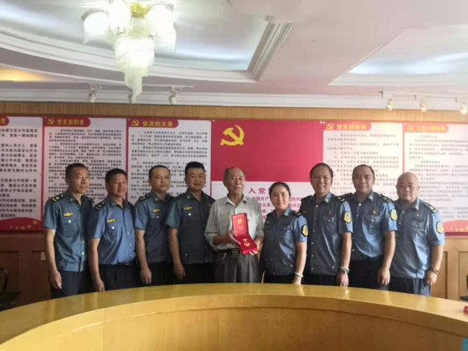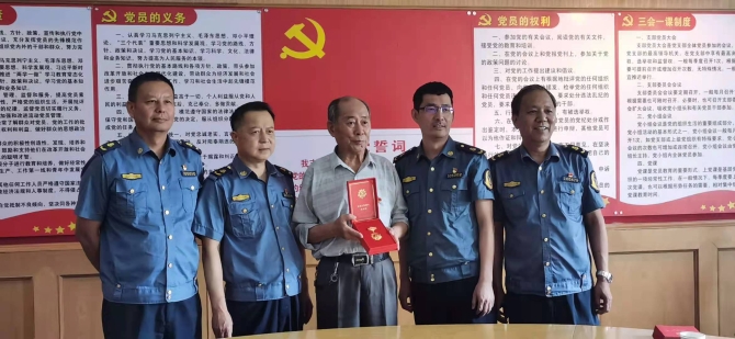 昆明信息港訊 記者昝娟娟 6月15日,昆明路政支隊(duì)領(lǐng)導(dǎo)到東川路政大隊(duì)為老黨員黎云萍頒發(fā)“光榮在黨50年”紀(jì)念章。