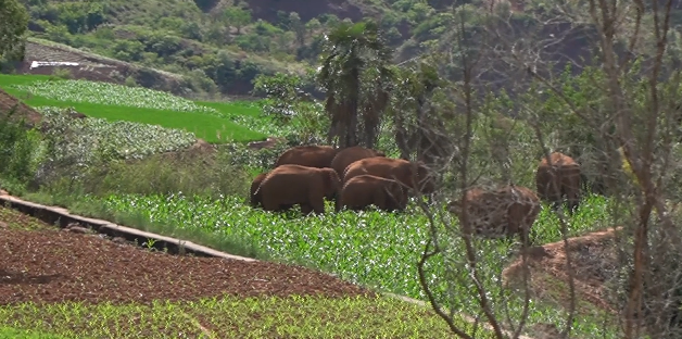 為了無(wú)縫跟蹤大象,監(jiān)測(cè)人員連夜換了四個(gè)監(jiān)測(cè)點(diǎn),清晨7點(diǎn),14頭大象在峨山縣大龍?zhí)多l(xiāng)迭所村委會(huì)下方300米山箐中不再移動(dòng)。