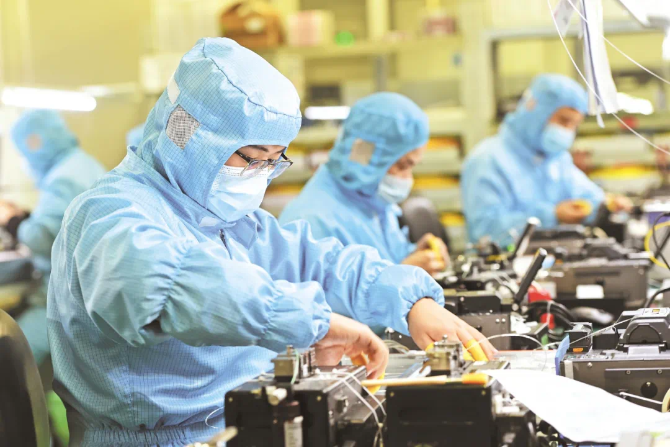 武漢銳科光纖激光技術股份有限公司脈沖光學車間,員工正在加緊生產光纖激光器光學模塊。(湖北日報全媒記者 李溪 攝)