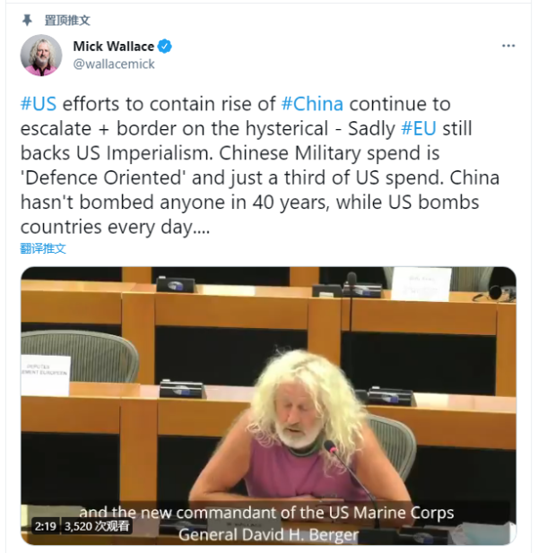 歐洲議會議員米克·華萊士(Mick Wallace)當(dāng)?shù)貢r間6月18日在其官方推特賬號發(fā)布了一段自己在議會發(fā)言的視頻。視頻顯示,在提到美國新海軍陸戰(zhàn)隊司令日前宣布進行巨大結(jié)構(gòu)調(diào)整以應(yīng)對中國的內(nèi)容時,華萊士連拋三問質(zhì)疑美國遏制中國崛起。他還在推特上表示,“中國在過去40年里沒有轟炸過任何人,而美國每天都在轟炸別國?!?/p>