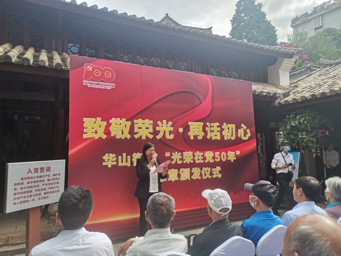 五華區(qū)區(qū)委常委、統(tǒng)戰(zhàn)部部長李正興出席,華山街道黨工委書記主持,轄區(qū)32位獲頒紀念章老黨員代表、街道班子成員及轄區(qū)8個社區(qū)的書記、主任參加了儀式。