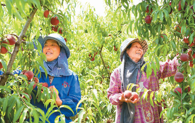 在安徽省阜陽市阜南縣新村鎮(zhèn)楊灣村合心家庭農(nóng)場,村民們在采摘成熟的桃子準備上市。戴文學攝(人民視覺)