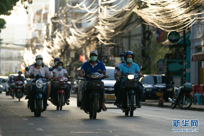 6月19日,市民佩戴口罩在老撾首都萬象城區(qū)騎行。老撾政府19日宣布,鑒于鄰國和首都萬象新冠疫情形勢(shì),萬象實(shí)施的“封城”措施再延長15天至7月4日。