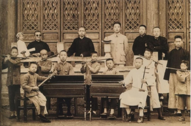 聶耳(前排左二彈三弦者)在學(xué)校的樂團里
