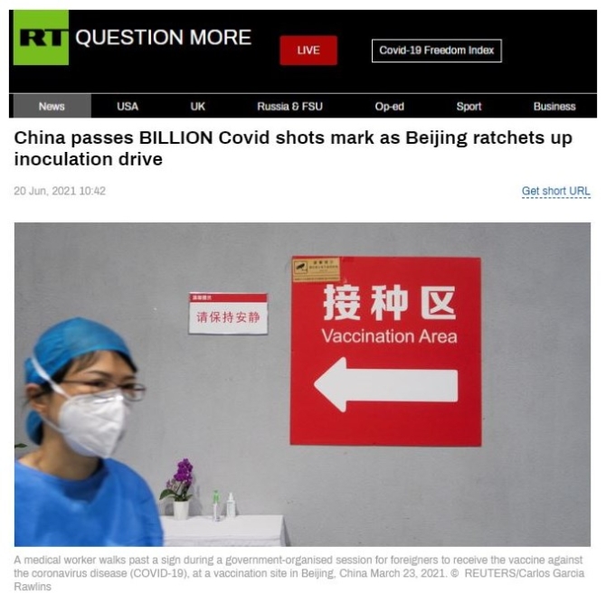 今日俄羅斯電視臺網(wǎng)站6月20日的報道說,中國已進(jìn)行了超過 10 億劑次的新冠疫苗接種,距離實現(xiàn)既定目標(biāo)越來越近。