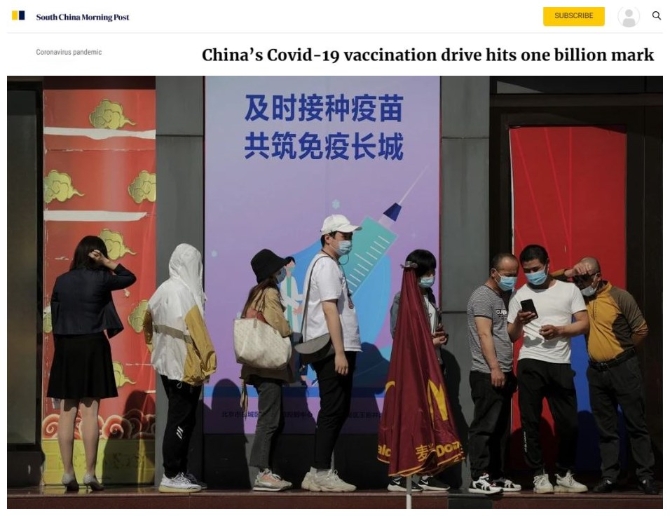 《南華早報》網(wǎng)站6月20日的報道說,中國在周末接種了第10億劑次新冠疫苗,對全球規(guī)模最大的疫苗接種計劃而言,這是一個重要的里程碑。