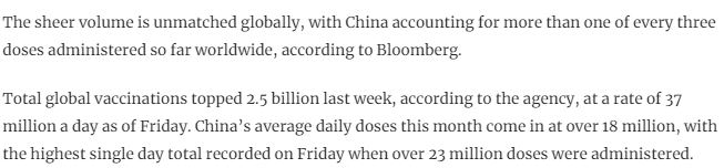 報道說,中國接種的新冠疫苗數(shù)量占目前全球25億劑次接種總數(shù)的40%。過去一個月內(nèi),中國的接種劑次超過了5億。