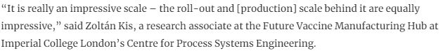 報道援引英國倫敦帝國理工學(xué)院一位疫苗研制專家的話說:“這樣的規(guī)模讓人印象深刻——而其背后的推進(jìn)和(生產(chǎn))規(guī)模同樣讓人印象深刻?!?br/>
