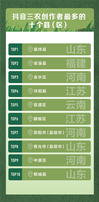 從三農(nóng)創(chuàng)作者的分布來看,來源最多的省份包括山東、河南、四川這樣的農(nóng)業(yè)大省,其次是廣東和云南。從縣級(jí)維度看,山東上榜最多,包括濟(jì)寧市嘉祥縣、菏澤市鄆城縣和濰坊市壽光縣。嘉祥、鄆城分別以黃牛養(yǎng)殖和農(nóng)業(yè)器械生產(chǎn)聞名,而壽光作為蔬菜之鄉(xiāng),疫情期間援助武漢備受關(guān)注。疫情穩(wěn)定后,作為全國蔬菜重鎮(zhèn),壽光瓜果借助抖音平臺(tái)銷往全國。