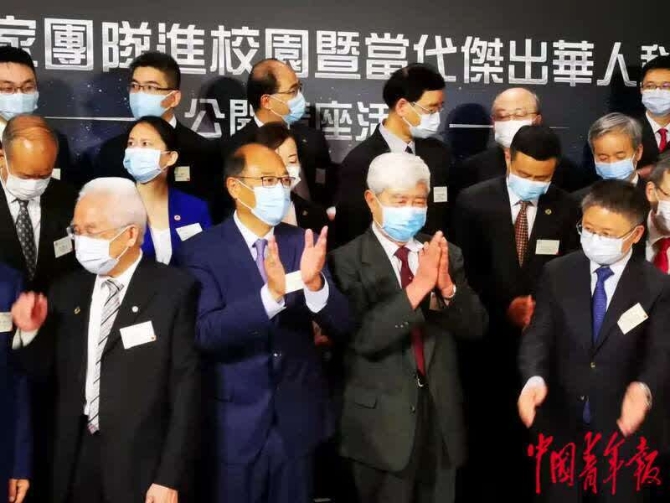 (6月23日,香港理工大學。88歲滿頭銀發(fā)的中國工程院院士、神舟飛船首任總設計師戚發(fā)軔(左二)和香港理工大學教授容啟亮(左三)的手緊緊握在一起。中青報·中青網(wǎng)記者 邱晨輝攝)