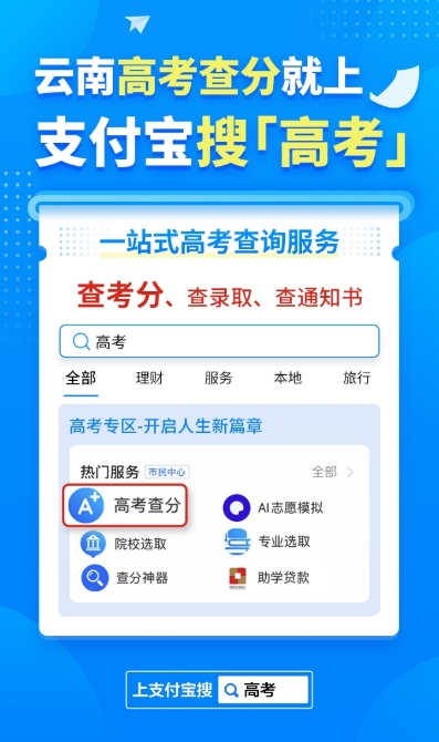 昆明信息港訊 記者昝娟娟 6月23日,全國各省市高考查分陸續(xù)開啟,支付寶也推出了最新的高考服務(wù)專區(qū),包括云南省在內(nèi)的全國23個?。ㄖ陛犑校┒伎梢酝ㄟ^支付寶進(jìn)行分?jǐn)?shù)查詢,同時新增了AI志愿模擬、國家助學(xué)貸款申請等6大服務(wù)板塊,現(xiàn)在考生和家長在支付寶上搜索“高考”就可直接進(jìn)入專區(qū)。