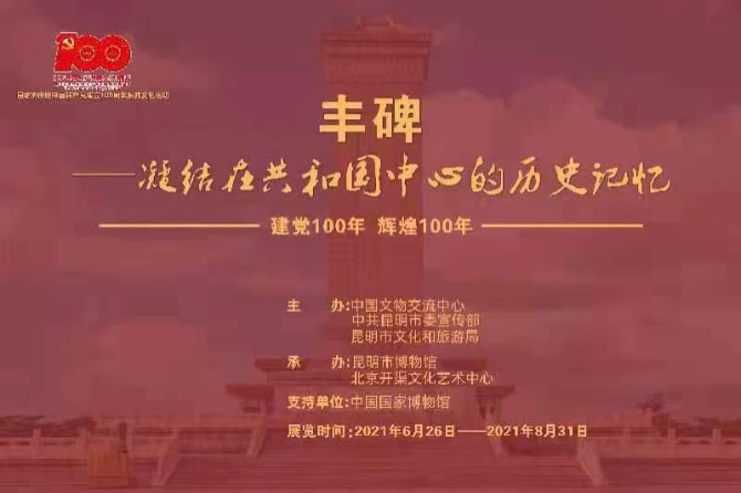 6月26日起,以“豐碑——凝結(jié)在共和國(guó)中心的歷史記憶”為主題的豐碑展在昆明市博物館開(kāi)展,展覽將持續(xù)到8月31日。該展覽是昆明市慶祝中國(guó)共產(chǎn)黨成立100周年系列文化活動(dòng)之一,由中國(guó)文物交流中心、中共昆明市委宣傳部、昆明市文化和旅游局主辦,昆明市博物館、北京開(kāi)渠文化藝術(shù)中心承辦,中國(guó)國(guó)家博物館提供專(zhuān)業(yè)技術(shù)支持。