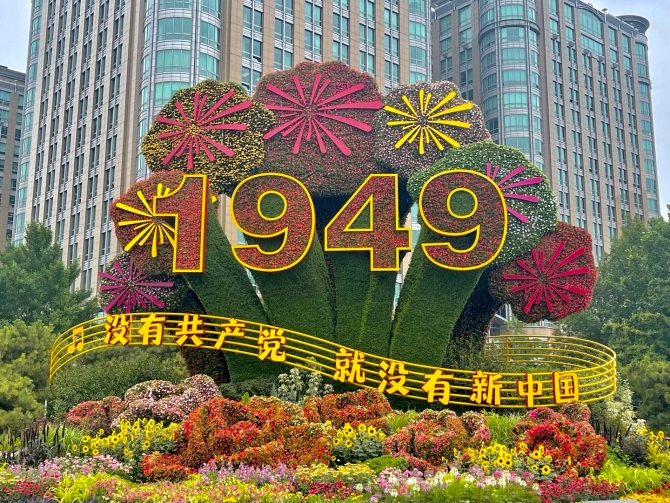 含義:花壇以“1949”、煙花為主景,配以《沒有共產(chǎn)黨就沒有新中國》樂譜、簇?fù)淼幕ǘ涞?,體現(xiàn)在中國共產(chǎn)黨的領(lǐng)導(dǎo)下,中國人民從此站起來的輝煌時刻。