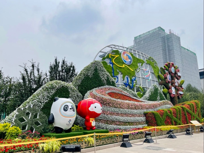 含義:花壇以鳥巢(2008年北京奧運會)、冰絲帶(2022年北京冬奧會)、世界地圖為主景,配以冬奧會吉祥物以及我國舉辦或參與的重大國際活動標(biāo)識,體現(xiàn)在黨的正確領(lǐng)導(dǎo)下,偉大的祖國闊步走向世界。
