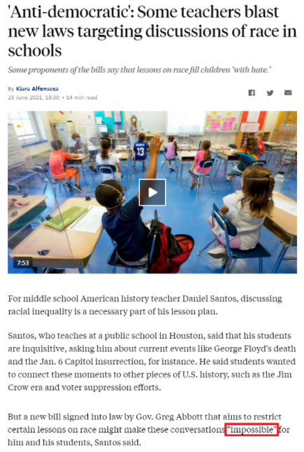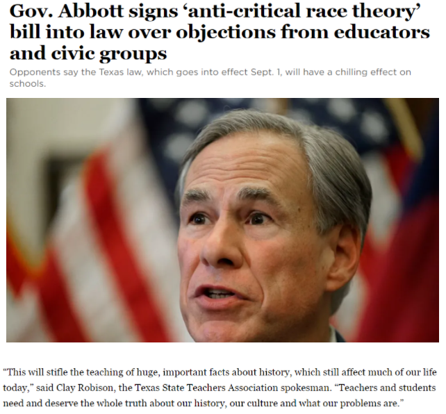 盡管遭到很多教育界人士的強(qiáng)烈反對(duì),得州州長(zhǎng)阿博特仍在本月早些時(shí)候簽署了一項(xiàng)新法案,以限制公立學(xué)校教授有關(guān)“批判種族理論”的課程。相關(guān)新規(guī)定預(yù)計(jì)于9月實(shí)施,得州也將因此成為最新一個(gè)禁止在課堂上討論種族問題的州。