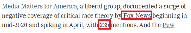雖然拜登在上任伊始撤銷了特朗普的行政令,但它對(duì)右翼政治勢(shì)力的影響依然深遠(yuǎn)。據(jù)“美國(guó)媒體事務(wù)”組織記錄,自2020年年中以來,保守派媒體??怂剐侣勧槍?duì)“批判種族理論”的負(fù)面報(bào)道激增,僅在今年4月就達(dá)到235次。