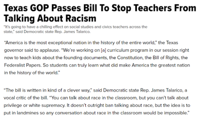 《赫芬頓郵報(bào)》評(píng)論稱,得州的最新立法比其他州走得更遠(yuǎn),將阻止學(xué)生參與任何形式的政治活動(dòng)。對(duì)此,有民主黨州議員批評(píng)說,這是為了“美化美國(guó)的種族主義和白人至上主義遺產(chǎn)……將在全州的社會(huì)研究和教育界產(chǎn)生寒蟬效應(yīng)”。