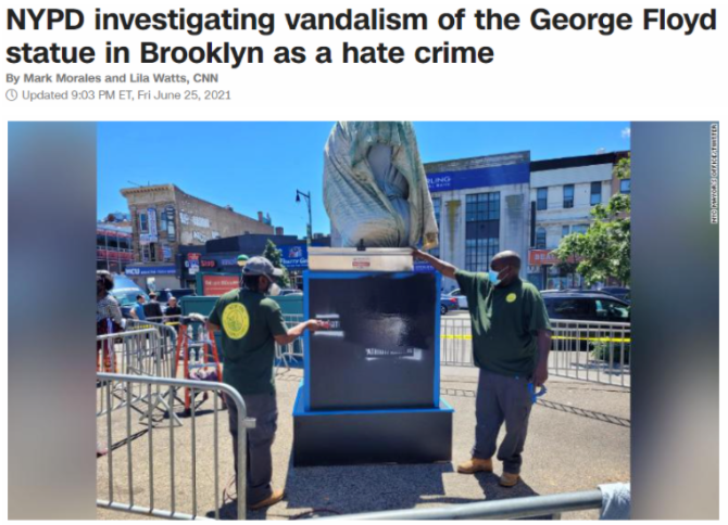 值得注意的是,就在對(duì)肖萬最終量刑前一天,紐約布魯克林一座弗洛伊德紀(jì)念雕像面部被人用黑色噴漆污損,雕像基座還被印上了白人至上組織的標(biāo)識(shí)。