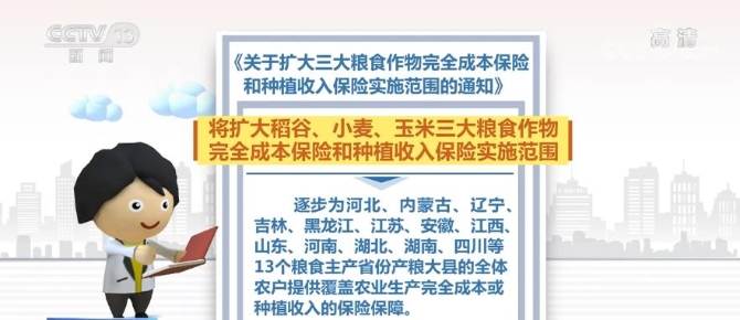 根據(jù)《通知》,將擴大稻谷、小麥、玉米三大糧食作物完全成本保險和種植收入保險實施范圍,逐步為河北、內(nèi)蒙古、遼寧、吉林、黑龍江、江蘇、安徽、江西、山東、河南、湖北、湖南、四川等13個糧食主產(chǎn)省份產(chǎn)糧大縣的全體農(nóng)戶提供覆蓋農(nóng)業(yè)生產(chǎn)完全成本或種植收入的保險保障。2021年覆蓋實施地區(qū)500個產(chǎn)糧大縣,2022年實現(xiàn)13個糧食主產(chǎn)省份產(chǎn)糧大縣全覆蓋。