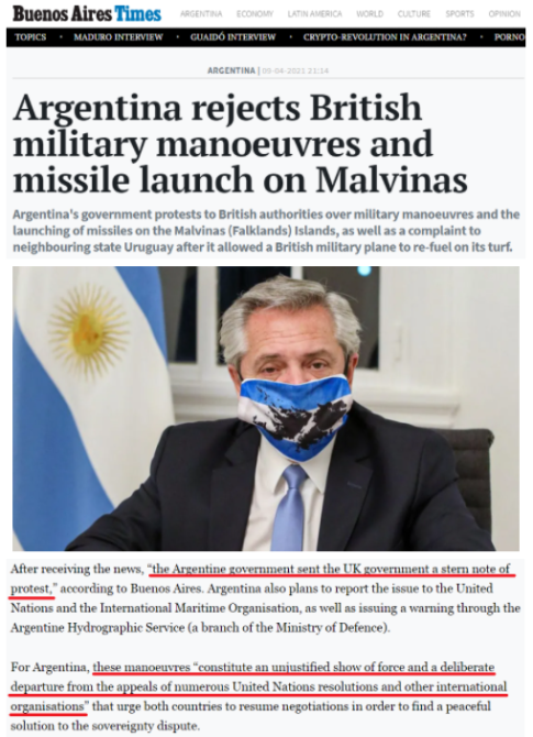 △《布宜諾斯艾利斯時報》報道截圖(題圖為阿根廷總統(tǒng)費(fèi)爾南德斯戴著印有阿根廷國旗顏色和馬爾維納斯群島地圖的口罩)