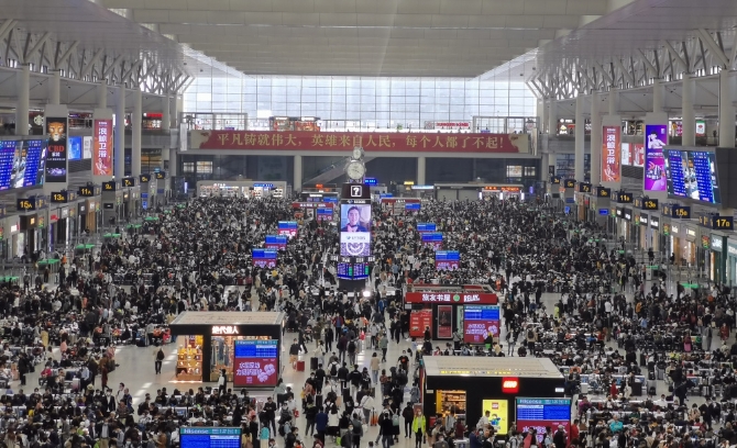 上海虹橋站候車大廳內(nèi),旅客們?cè)谟行蚝蜍?(圖片來(lái)源:上海鐵路)