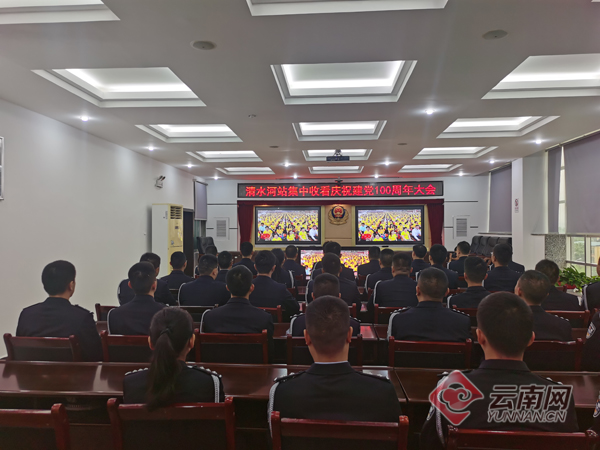 云南清水河出入境邊防檢查站組織全站民輔警觀看慶祝中國(guó)共產(chǎn)黨成立100周年大會(huì)。