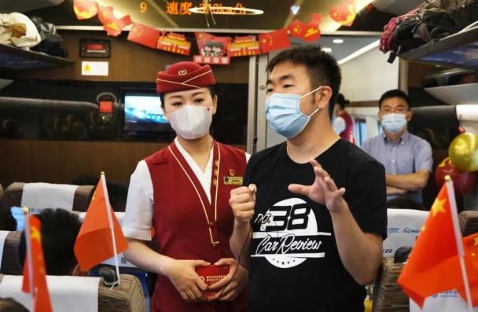 旅途中,列車長官淼帶領(lǐng)乘務(wù)員組織旅客參加了“京滬高鐵十年故事”有獎(jiǎng)競(jìng)猜活動(dòng)。