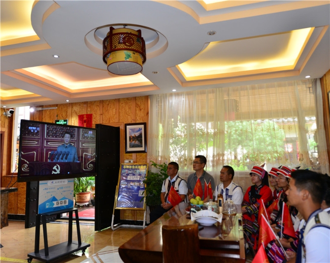 石林縣彝族第一村村民圍坐在自家的民宿客棧一起收看大會盛況