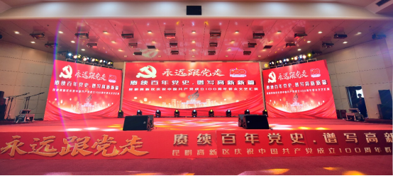 會場外,高新區(qū)的建區(qū)大事記、發(fā)展成就、人才薈萃、企業(yè)風(fēng)采展示內(nèi)容與中國共產(chǎn)黨成立100周年慶?;顒訕?biāo)識相互輝映、格外醒目;國際會議廳燈光璀璨、氣氛熱烈,洋溢著濃濃的節(jié)日氣氛,循著歷史的年輪,追尋百年奮斗的閃亮足跡,向中國共產(chǎn)黨的百年風(fēng)華,致以昆明高新人最美好的祝福,最崇高的敬意!