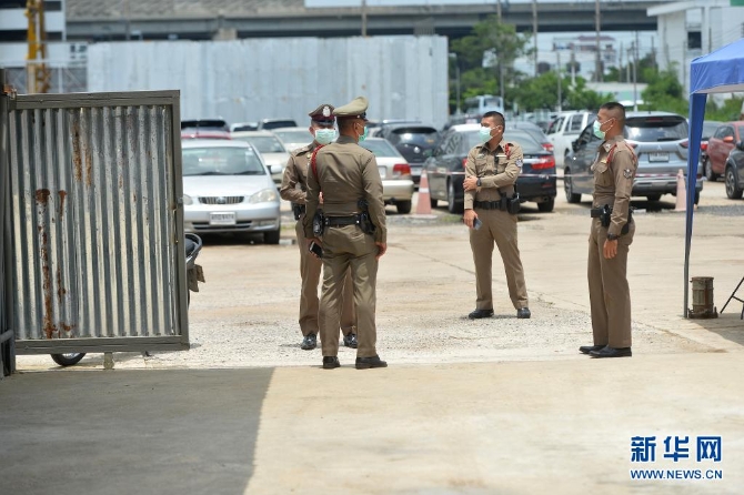 6月29日,一名警察在泰國曼谷一檢查點執(zhí)勤,防止建筑工人離開。新華社發(fā)(拉亨/攝)