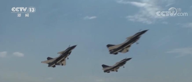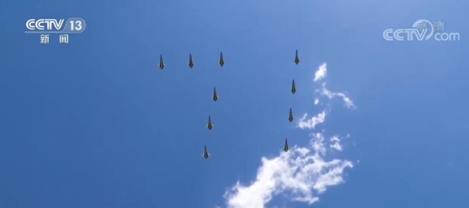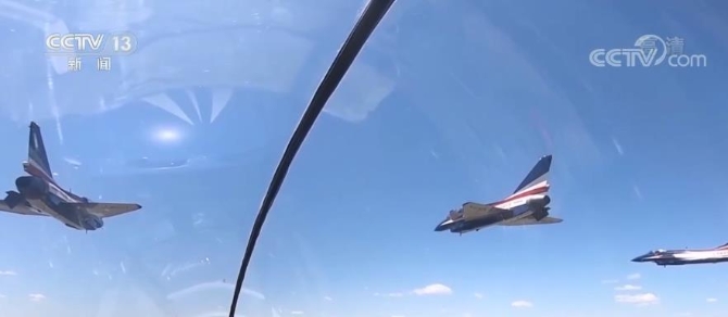 這是7月1日早晨,飛機(jī)起飛時(shí)的畫面。數(shù)架殲-10表演機(jī)以3機(jī)編隊(duì)梯次起飛,在空中迅速集結(jié),按預(yù)定方案組成“71”字樣,飛赴天安門上空。