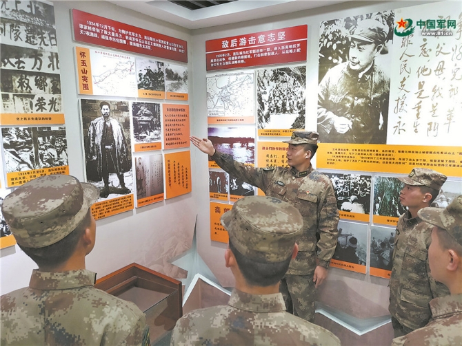 第80集團(tuán)軍某旅“紅六連”將黨史學(xué)習(xí)教育課堂搬進(jìn)榮譽(yù)室,幫助官兵直觀形象地學(xué)習(xí)黨史知識。圖為指導(dǎo)員王琳(右三)正在為剛下連的列兵講述連隊(duì)光榮傳統(tǒng)。常皓博攝
