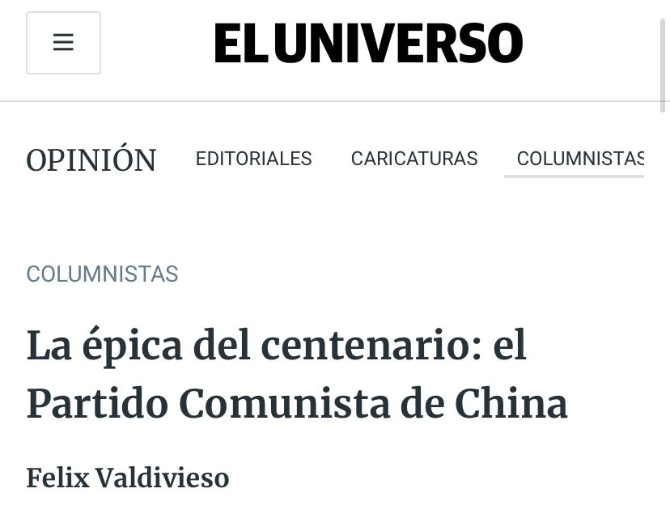 厄瓜多爾《宇宙報》網(wǎng)站近日發(fā)表了西班牙IE大學(xué)中國中心主任費利克斯·巴爾迪維索的文章《百年史詩:中國共產(chǎn)黨》。文章說,在中國,有一首廣為流傳的歌曲名叫《沒有共產(chǎn)黨就沒有新中國》?!靶隆币馕吨c過去的屈辱歷史一刀兩斷。現(xiàn)在我們面對的是一個煥然一新的中國,它已完成了自我重塑。