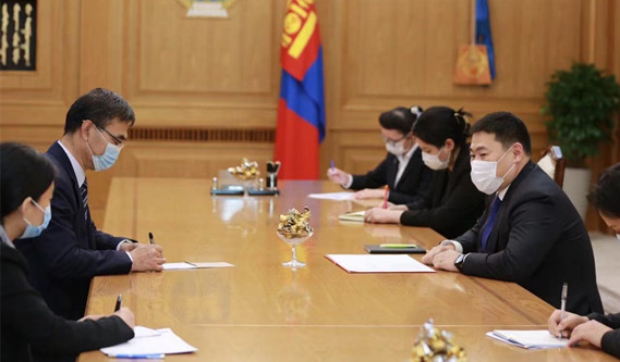當(dāng)?shù)貢r間7月1日,蒙古國政府總理兼人民黨主席奧云額爾登在烏蘭巴托會見中國駐蒙古國大使柴文睿,祝賀中國共產(chǎn)黨成立100周年。