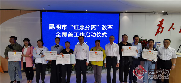 7月1日,昆明市“證照分離”改革全覆蓋工作啟動(dòng)儀式在五華區(qū)政務(wù)服務(wù)中心舉行,為云南澤源商貿(mào)有限公司、昆明市五華區(qū)厚合辦公用品經(jīng)營(yíng)部等首批享受到“證照分離”改革全覆蓋紅利的市場(chǎng)主體頒發(fā)營(yíng)業(yè)執(zhí)照和許可證。這是昆明市在建黨百年之際,在全省率先啟動(dòng)、與全國(guó)同步實(shí)施“證照分離”改革全覆蓋工作,為廣大市場(chǎng)主體送上的一份大禮包。