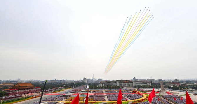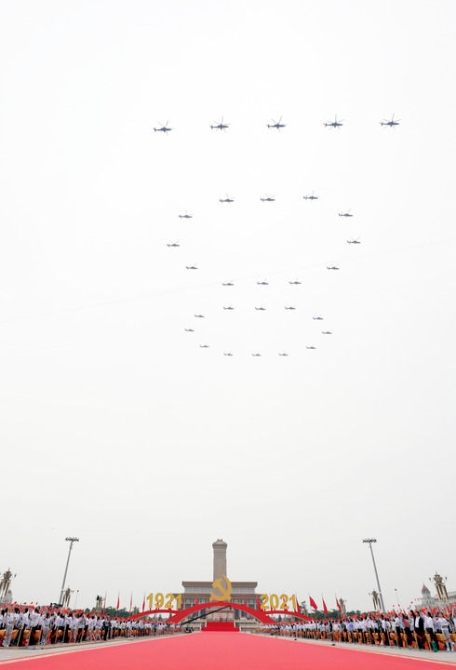 7月1日上午,慶祝中國共產(chǎn)黨成立100周年大會在北京天安門廣場隆重舉行。這是大會開始前的飛行慶祝表演。新華社記者 饒愛民 攝