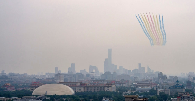 這張照片我是從天安門城樓西紅墻南側(cè)的消防云梯車上拍攝的。從技術(shù)角度來說幾乎沒有拍攝難度:坐上云梯車升起后,選擇好合適的鏡頭,提前曝光取景,耐心等候飛機進入畫面右上角位置,按下快門、傳稿入庫即可。