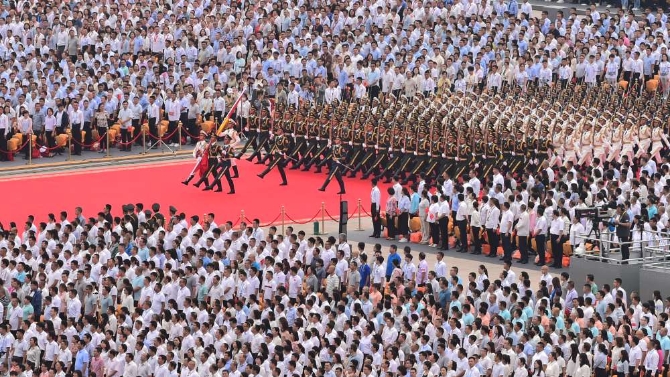 禮炮鳴放是慶祝大會的重要環(huán)節(jié),國旗護衛(wèi)隊伴隨著100響禮炮聲,邁著鏗鏘有力的步伐,走向升旗區(qū),氣氛莊重肅穆。
