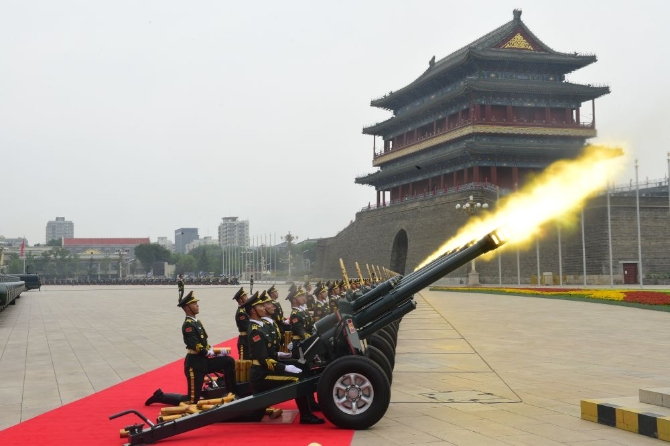 禮炮陣地在毛主席紀念堂和正陽門之間,鳴放時,禮炮聲震耳欲聾,炮管噴出火舌,皮膚可以感受到?jīng)_擊波帶來灼熱感。每一聲炮響時,站在一旁的記者們都一起跟隨著“一顫”。