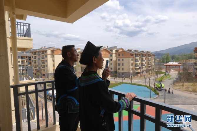 在四川省昭覺縣城易地扶貧搬遷安置點(diǎn)南坪社區(qū),剛搬遷到新家的“懸崖村”村民莫色達(dá)體夫婦在陽臺(tái)給親戚打電話(2020年5月13日攝)。新華社記者 江宏景 攝